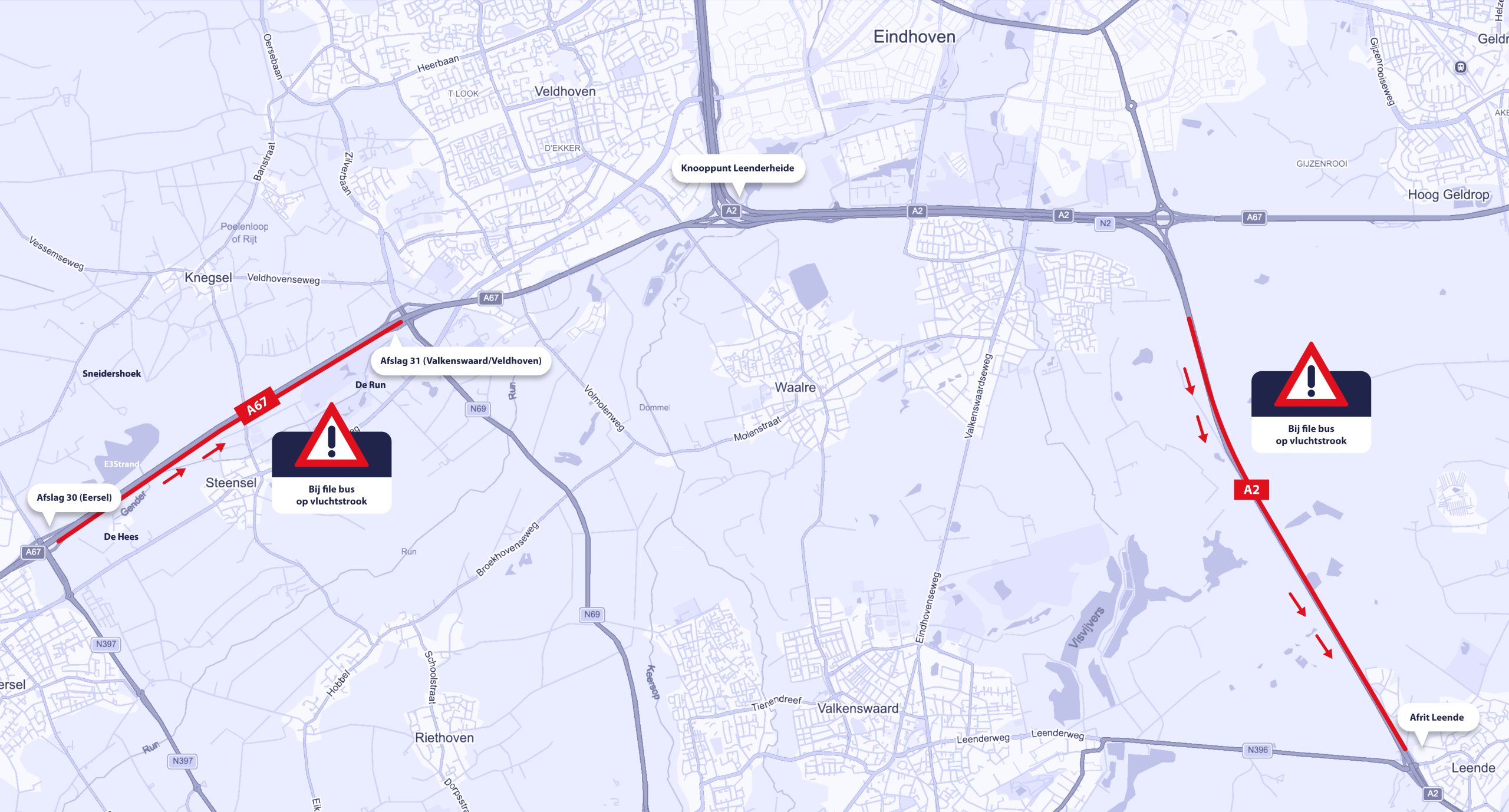 Vanaf eind juni 2025 kunnen bussen tijdens files gebruikmaken van de vluchtstrook op de A67: traject van 4,5 km op de zuidelijke rijbaan van de aansluiting Eersel tot de aansluiting Valkenswaard/Veldhoven richting Eindhoven.